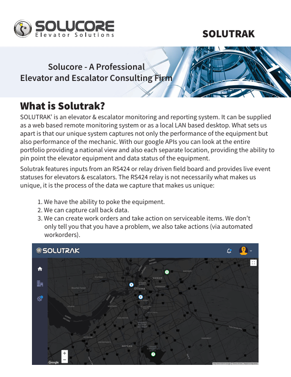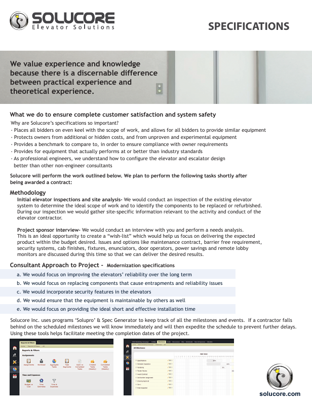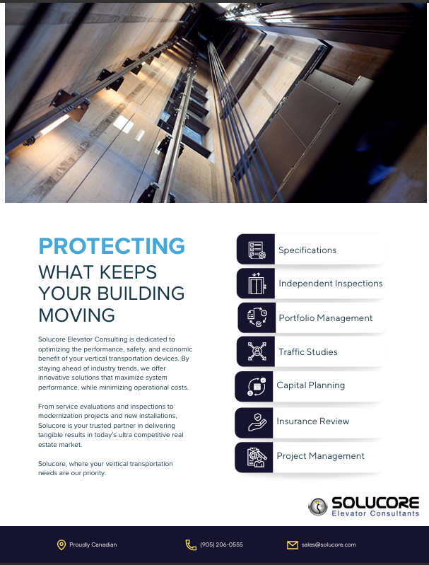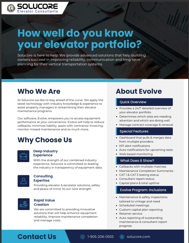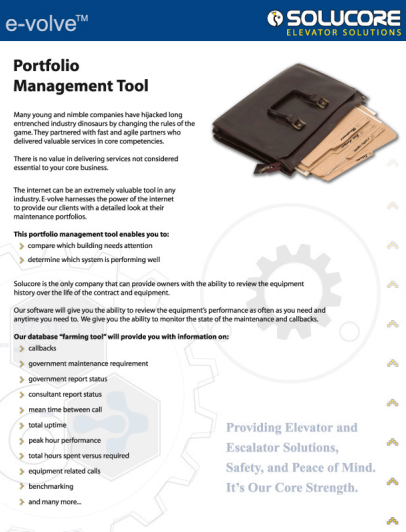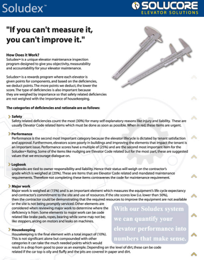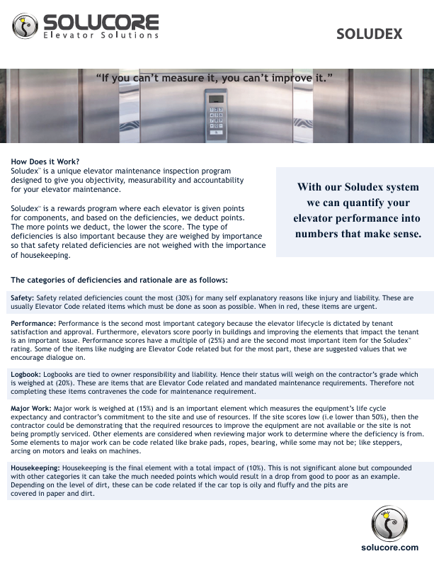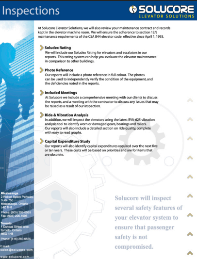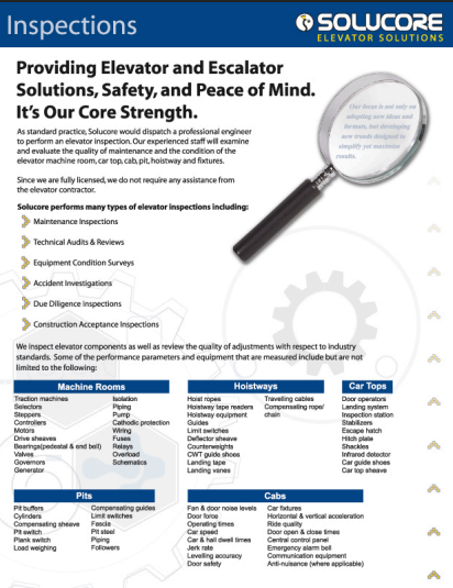 Below is a listing of current brochures on Solucore COVID-19 Elevator Etiqutte 1 2020-06-04 COVID-19 Elevator Etiqutte 2 2020-06-04 COVID-19 Elevator Etiqutte 3 2020-06-04 COVID-19 Elevator Etiqutte 4 2020-06-04 e-volve™ Screen Shots Soludex™ Benefits Soludex™ How Does it Work? Elevator Inspection Elevator Inspection e-volve™ Portfolio Management Tool Why Hire a Consultant SOLUTRAK-Collateral Soludex rating-Collateral Solucore Specifications-Collateral Solucore Maintenance Contract Solucore Inspections-Collateral Solucore Services Evolve