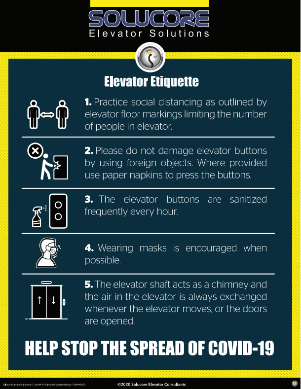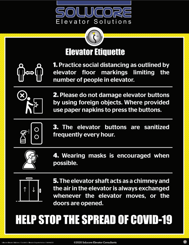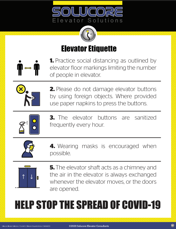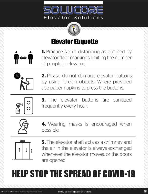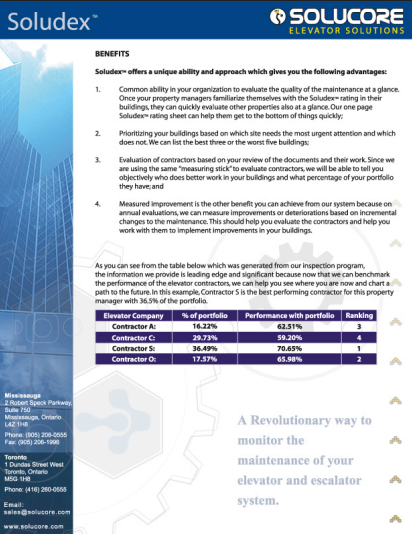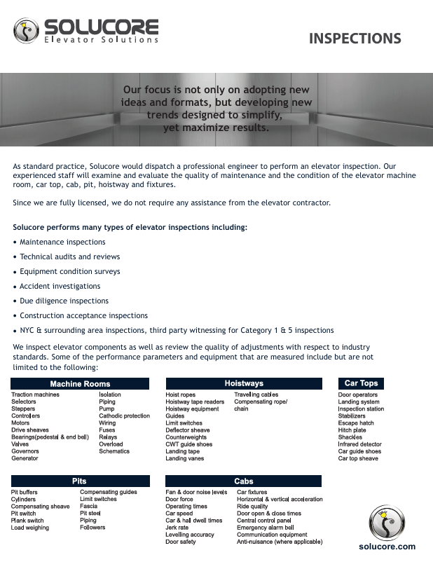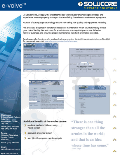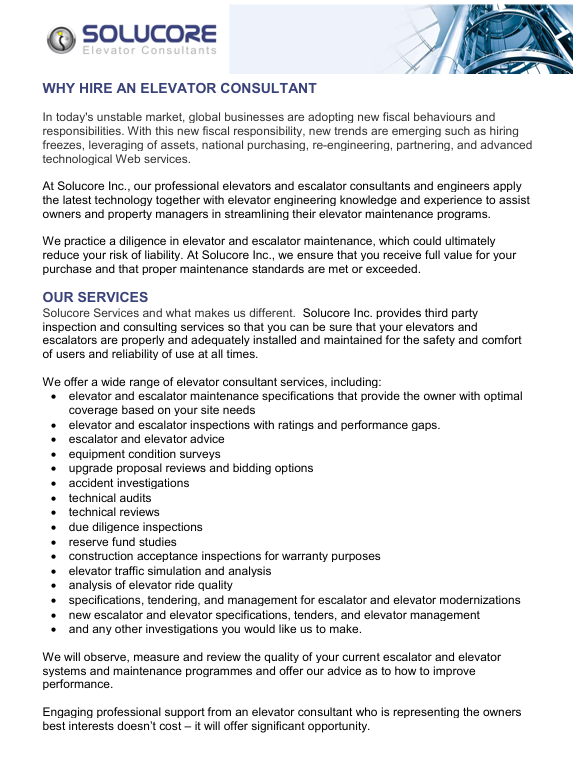 Below is a listing of current brochures on Solucore COVID-19 Elevator Etiqutte 1 2020-06-04 COVID-19 Elevator Etiqutte 2 2020-06-04 COVID-19 Elevator Etiqutte 3 2020-06-04 COVID-19 Elevator Etiqutte 4 2020-06-04 e-volve™ Screen Shots Soludex™ Benefits Soludex™ How Does it Work? Elevator Inspection Elevator Inspection e-volve™ Portfolio Management Tool Why Hire a Consultant SOLUTRAK-Collateral Soludex rating-Collateral Solucore Specifications-Collateral Solucore Maintenance Contract Solucore Inspections-Collateral Solucore Services Evolve